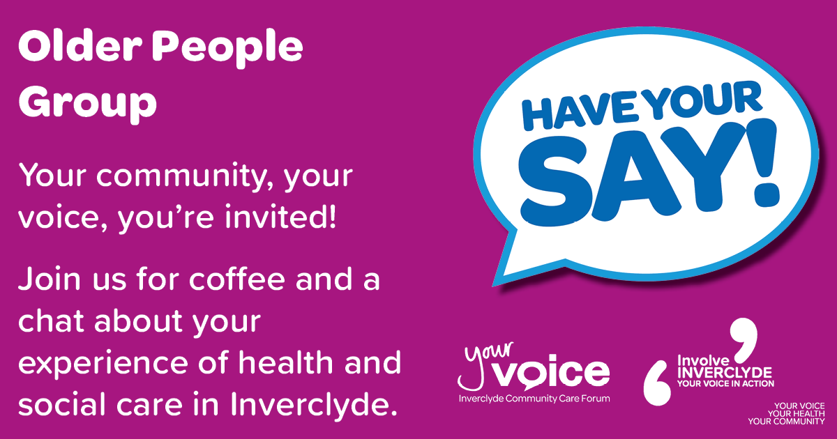This is a meeting for our Older People Sub-Group, to discuss experiences, ideas and opinions regarding health and social care within Inverclyde.