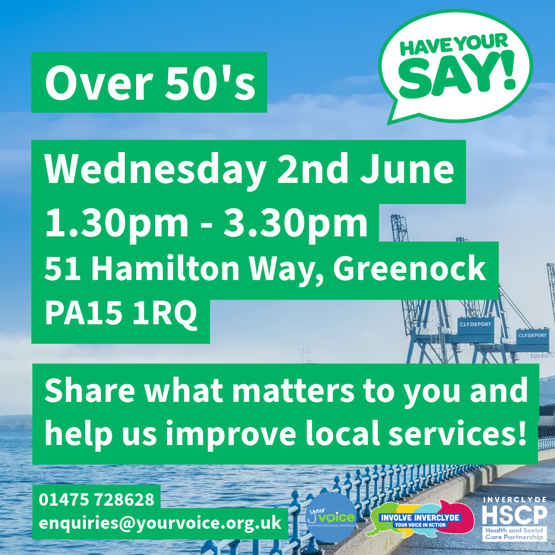 This is a meeting for our Over 50’s Group, to discuss experiences, ideas and opinions regarding health and social care within Inverclyde.