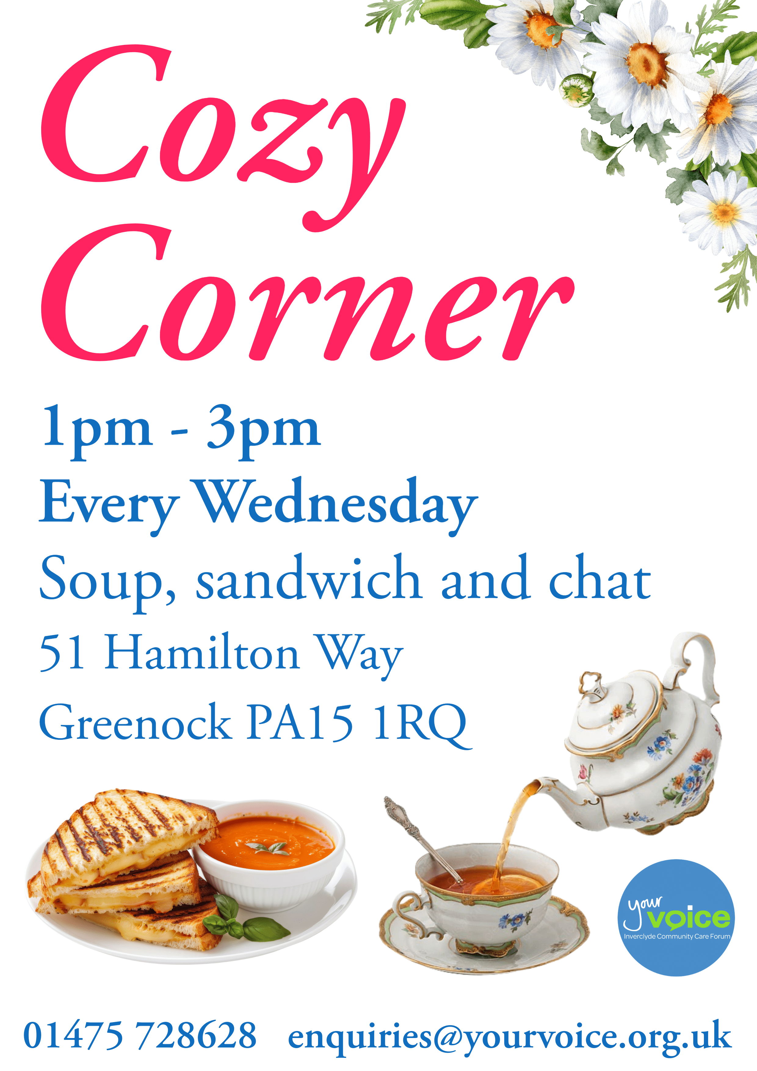 Join our new Cozy Corner group, starting next Wednesday! Soup, sandwich and a chat in a safe and cozy environment!